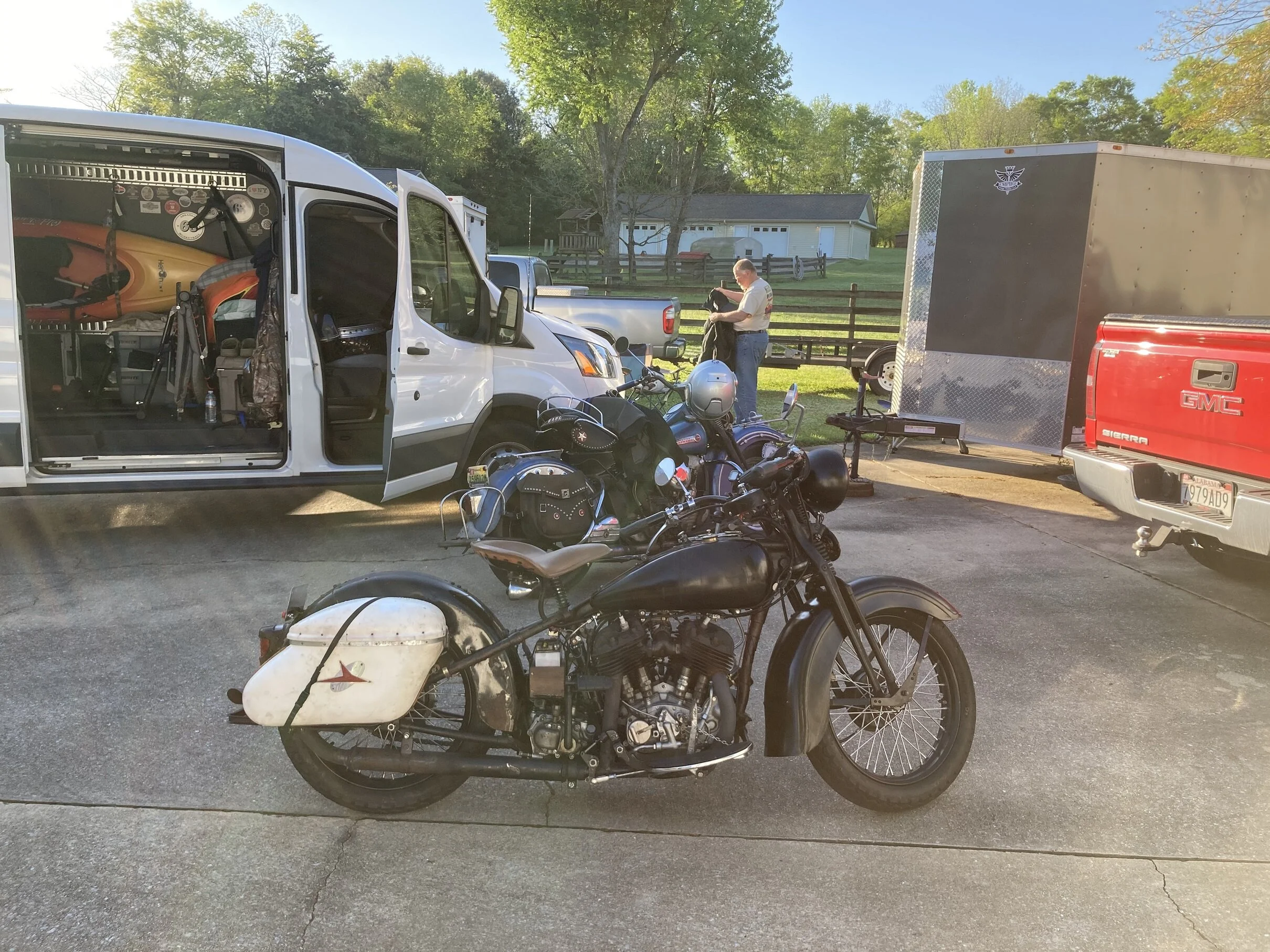We were pretty far along in the ride when suddenly my 1947 Knuckle lost power. Over to the side of the road I went. The dash lights were out but the headlight was working. After a quick diagnosis it turned out the coil had lost power. A little bypass magic and I had the bike running again but thought it might be prudent to shorten the ride as I did not know the cause of this issue. 45 minutes later we made it back, relaxed and loaded up to head home. (It turned out to be a broken wire at the ignition switch). I believe going through roadside troubleshooting did benefit Cecil as this is the kind of thing you need to do on the Chase more often than you want.