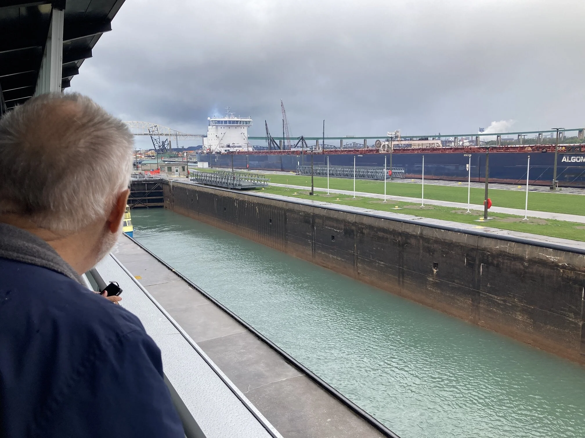 Below Dorsey is gazing over the top of the enormous ship in one of the locks in Sault STE Marie. On the Saint Mary’s River. This river connects Lake Superior with Lake Huron.  Looking over the top of the locks you can see Canada. Nope – we could not see Mike Podger our only Canadian member waving and wishing us good luck!
