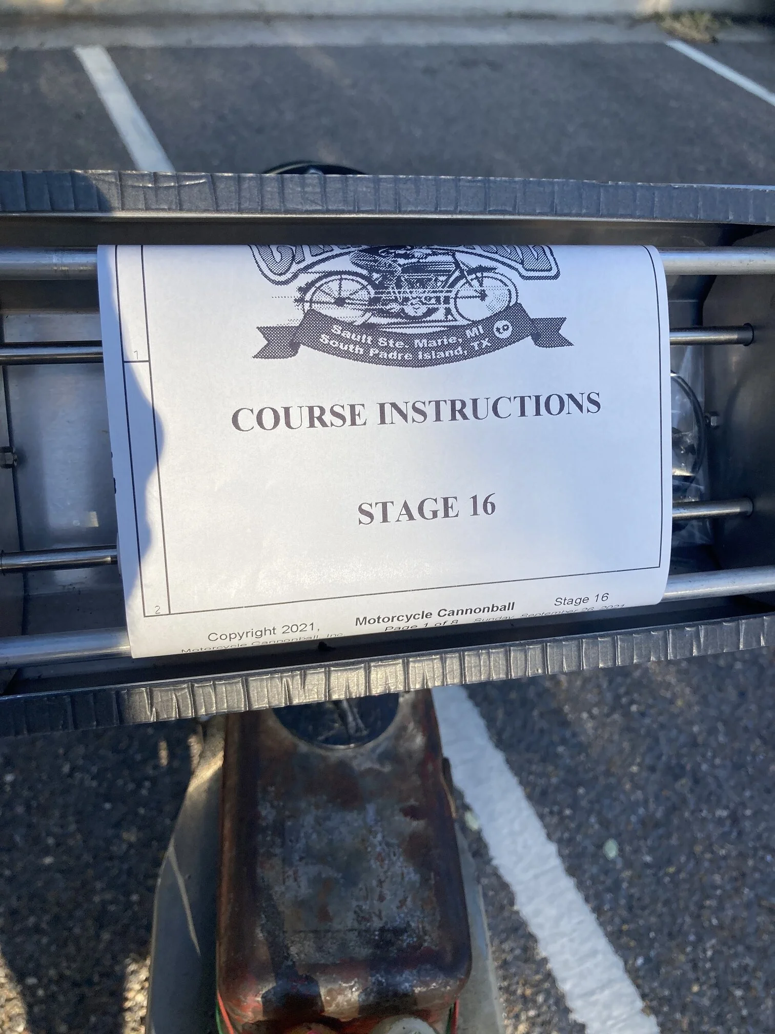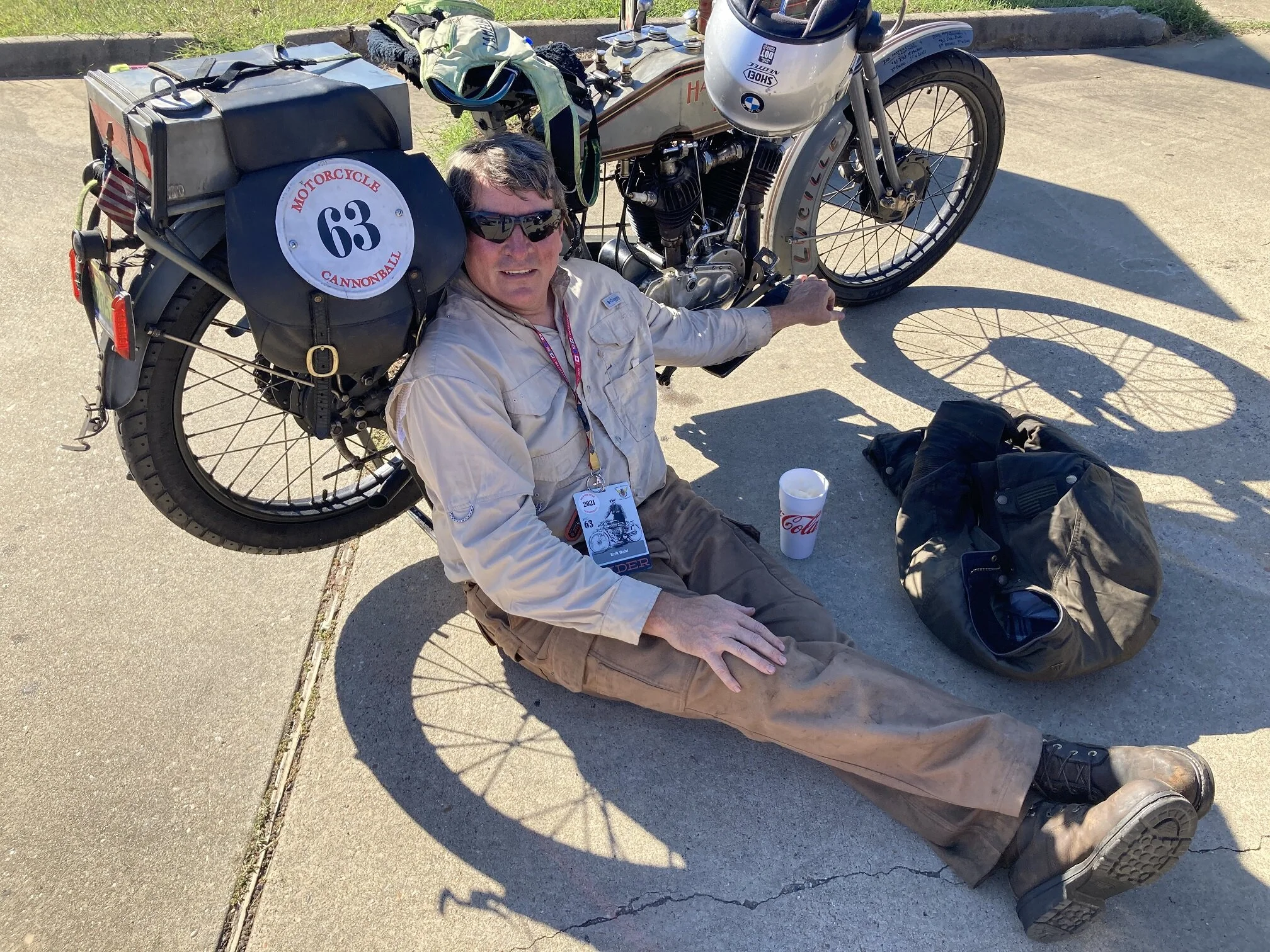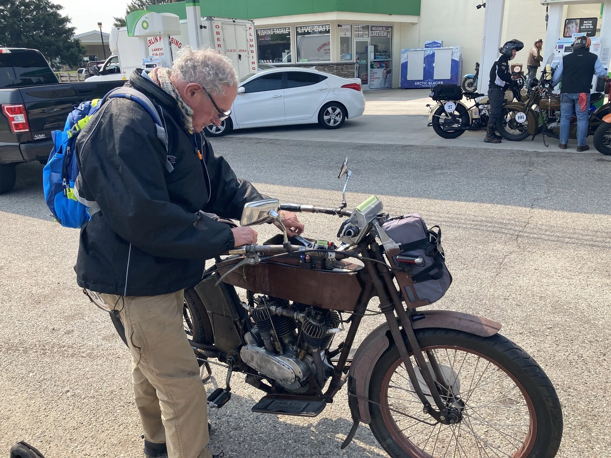 As usual, what I expect to be an easy day gets out of control quick. Here I am at mile 47 of a 243-mile day. Yes, in the background is a sweep truck along with Cannonball staff. Behind me on the ground is Bill Page #10. He lost exhaust valve function on one cylinder and ended up on the sweep truck for the day. Me, I was turning into the gas station and my primary chain broke again (this is #3 in two days). So, I did the repair with the sweep team waiting to load me up and was out of the parking lot before they got too serious.