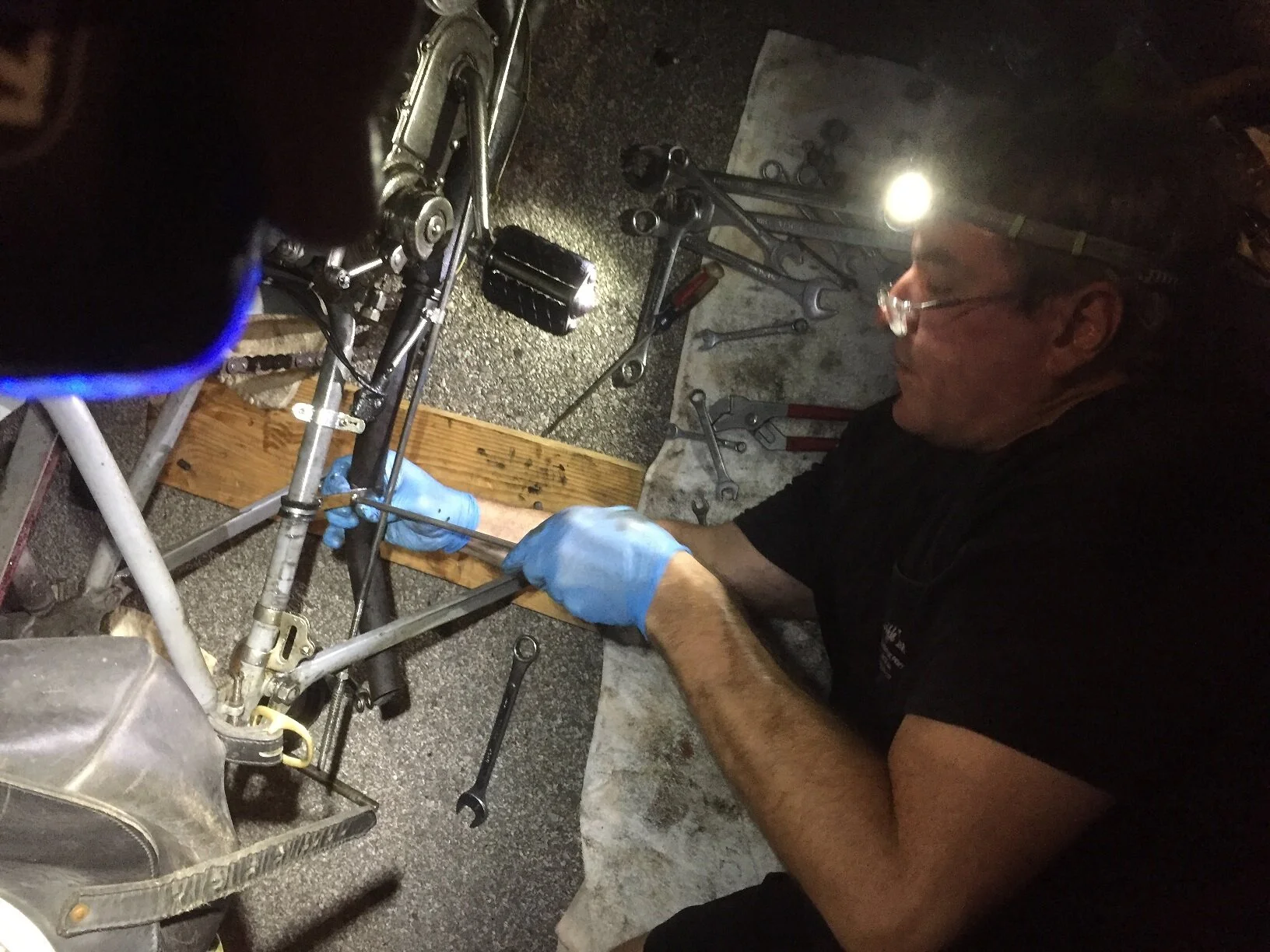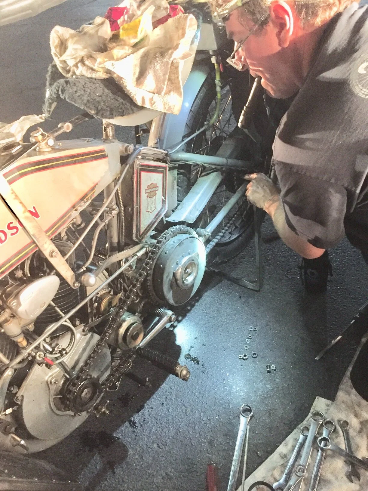 End of the day routine. Bartek working on his Indian Power Plus. Fixing a gas tank leak and then moving on to an intake leak.