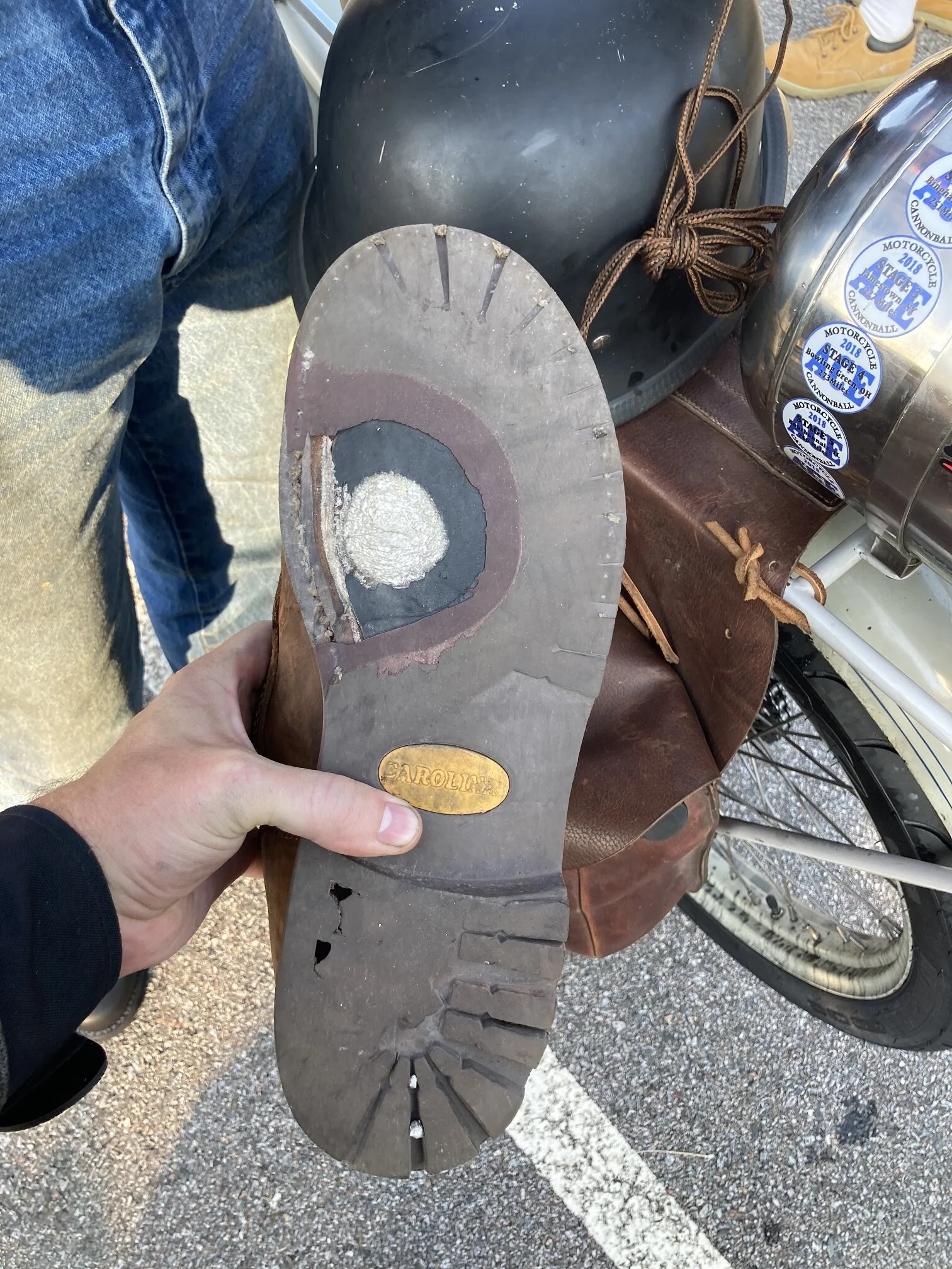 So, when you are in the hills and your Excelsior brake is barely functional what do you do? You use your shoes. He wore through the soles of both boots. At the end of the day Keegan picked up a new set of boots at our hosted stop at the Harley dealer. So he is ready for another day.