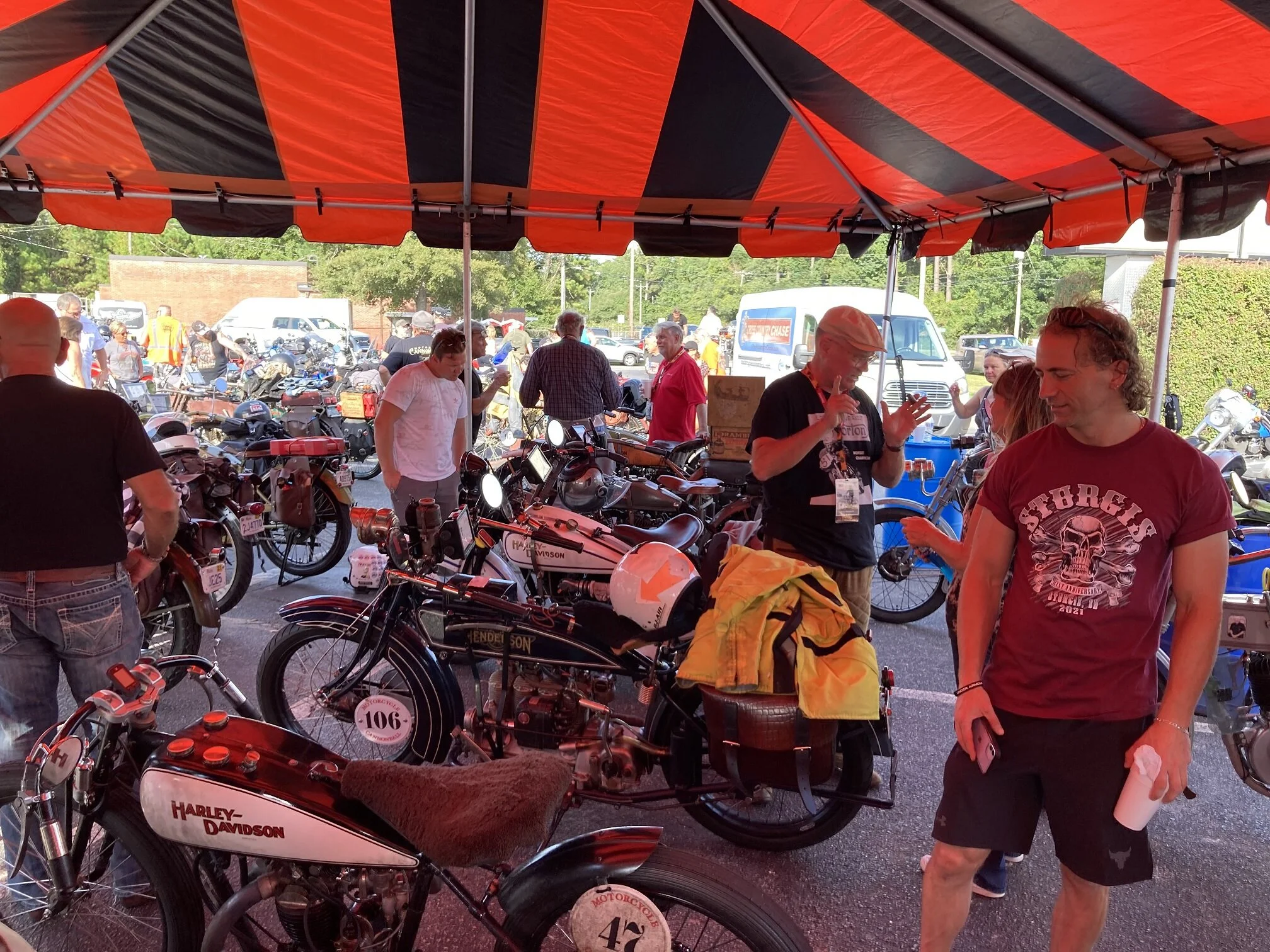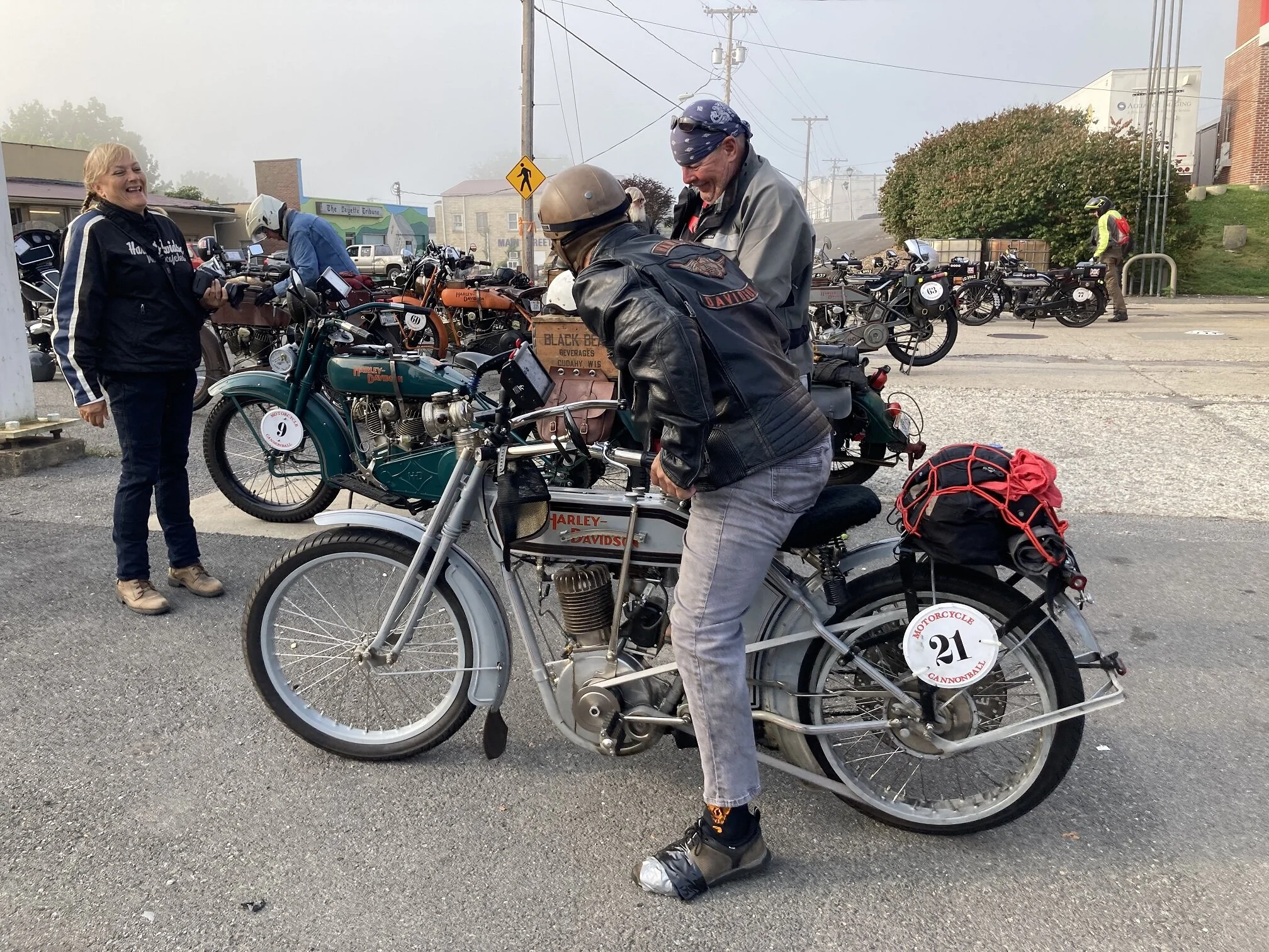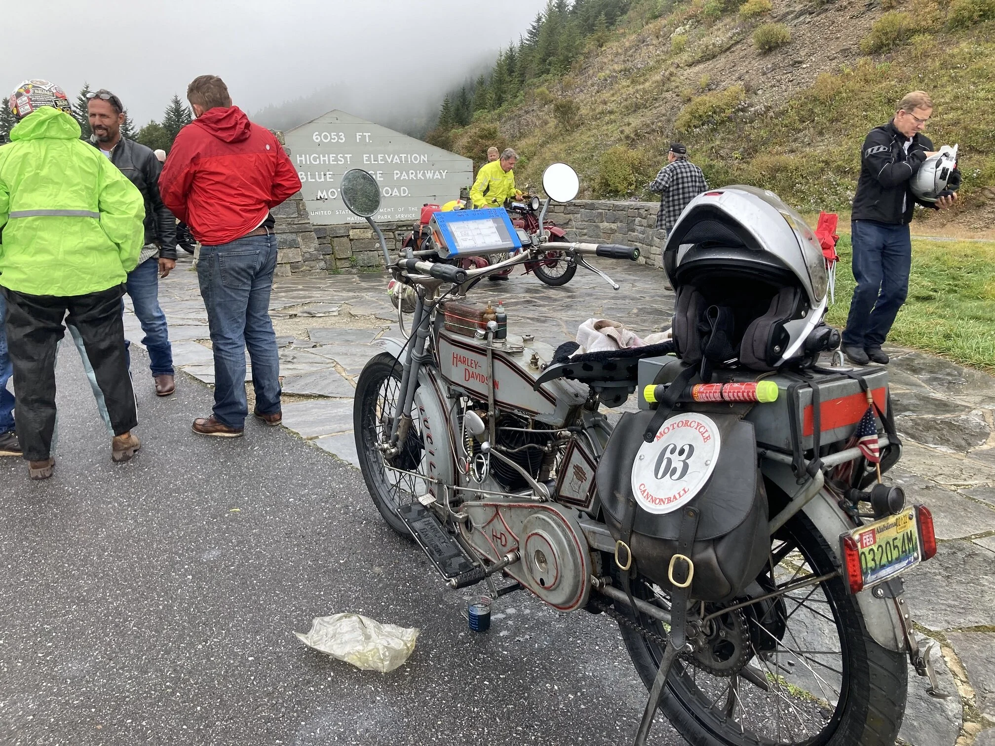 Today our hosted stop was Wheels Through Time Museum in Maggie Valley NC. We covered 135 miles, which by Cannonball standards was relatively short. I thought it was going to be an easy day. Boy, was I wrong. halfway through the day we started climbing. For the most part this went on for 70 miles. I spent a lot of time in 2nd gear going 30, glad that I was making forward progress. We ended up on the Blue Ridge Parkway for at least 40 miles. We reached an elevation of 6000+ feet which means I lost horsepower in my carbureted Harley. To top it off the parkway was shrouded in heavy fog and rain most of the day. It’s the Cannonball! Below is a photo at the highest point on the parkway. Doing an oil change on Lucille.