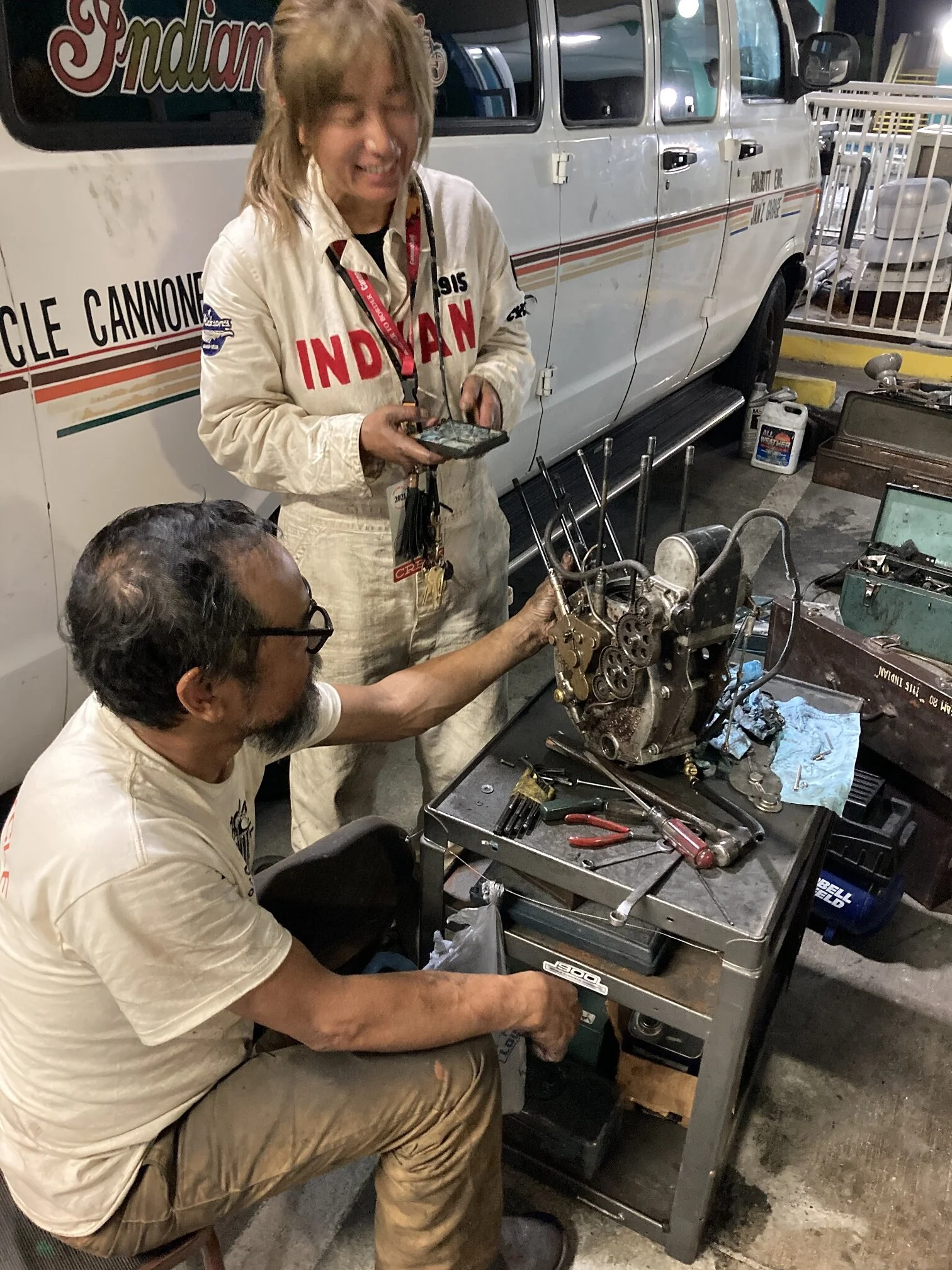 Shinya’s Indian was pulling cylinder studs out of the case. He tried to keep the cylinders attached with vise grips and safety wire but ran out of luck
