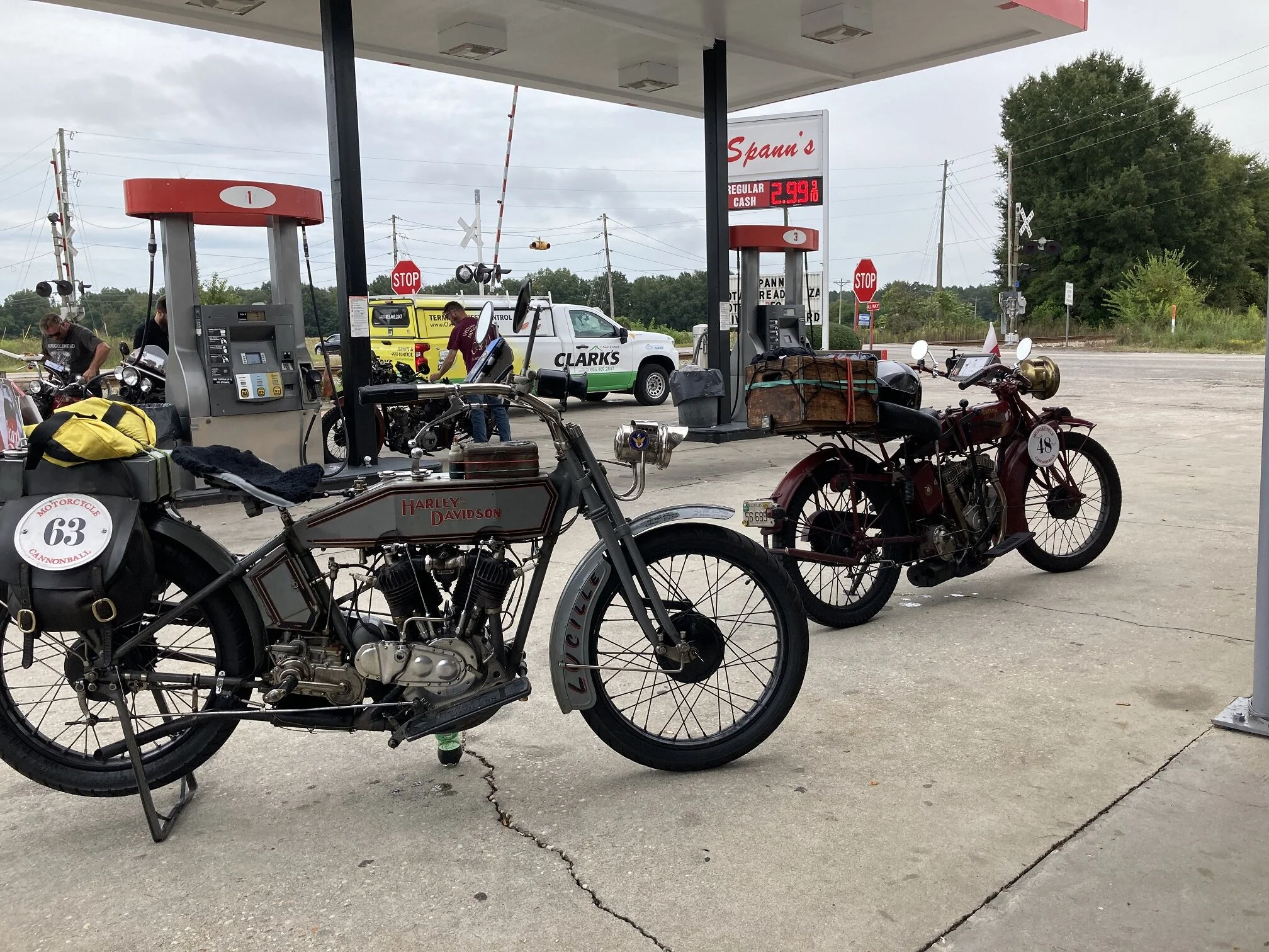 We arrived in Trussville mid-afternoon and setup camp in the hotel parking lot. It was a relaxed afternoon where many were fixing last minute issues. I helped one rider by soldering up a crack in his gas tank and gave my two cents on a magneto problem another rider had. Cecil and Wes showed up to see the circus.