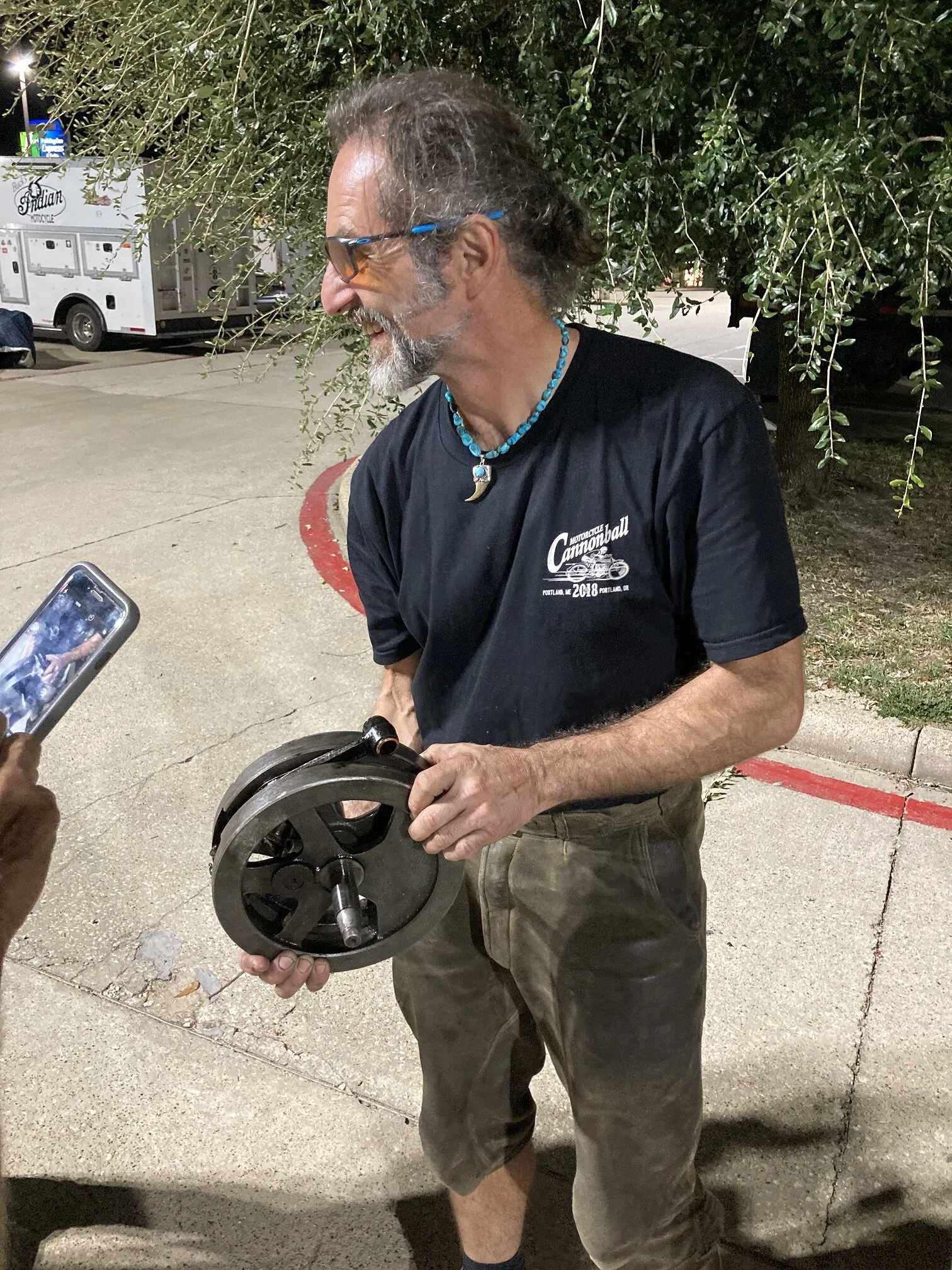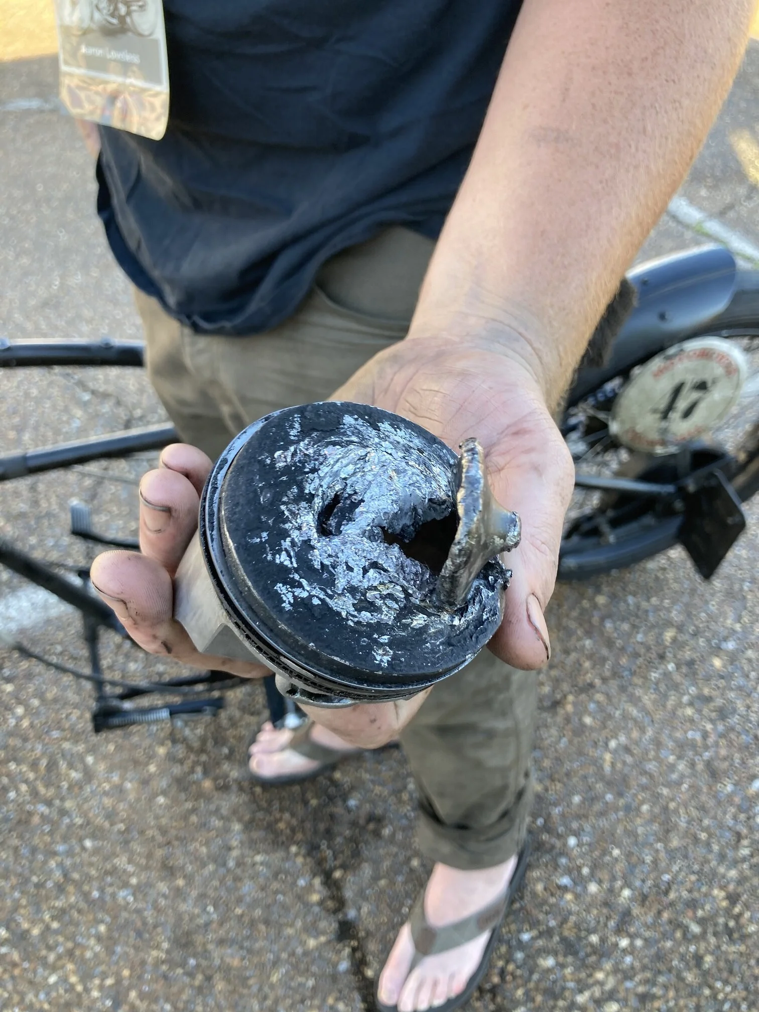 This morning on my way to pick up my daily route chart I ran into Aaron Loveless #47. He is riding an interesting bike. It’s a single cylinder Harley that he must push start. He did not ride today as he is doing an engine rebuild. Yep, that is a valve head embedded in the top of his piston!