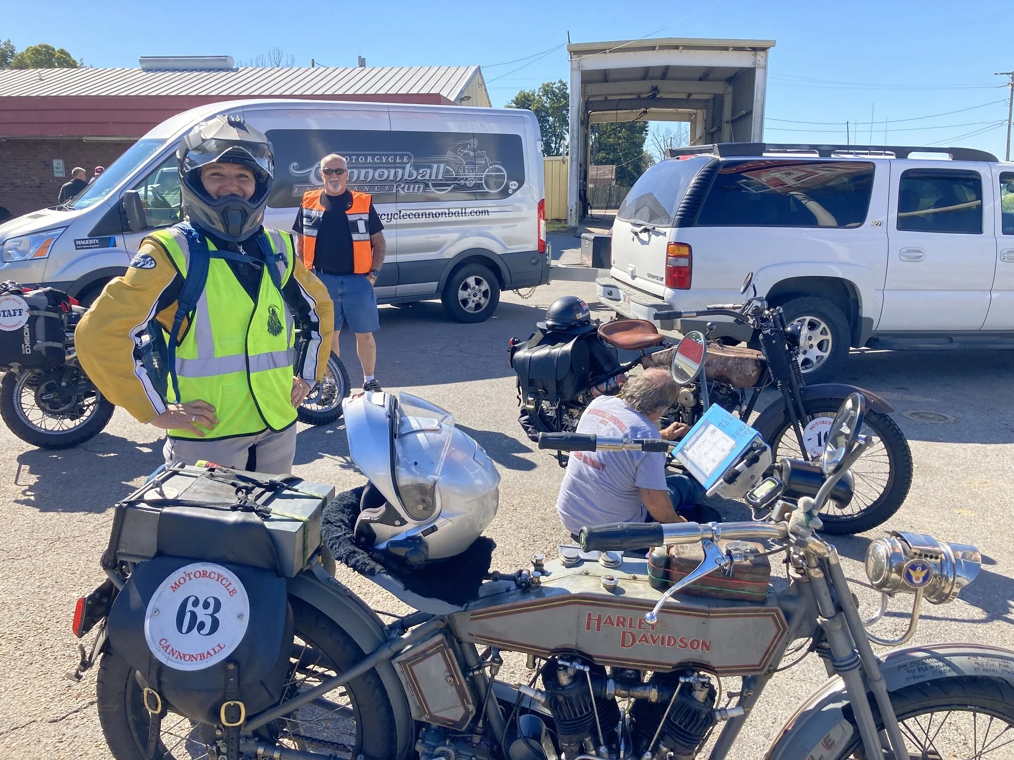 So the official start was a pretty short run. However, in typical Cannonball fashion there is attrition. 5 riders have already lost their perfect score. Juergen Ullrich from Germany is our only foreign rider. He is riding a bone stock 1911 Harley Davidson single cylinder. He made it one mile before he lost his front wheel bearing.