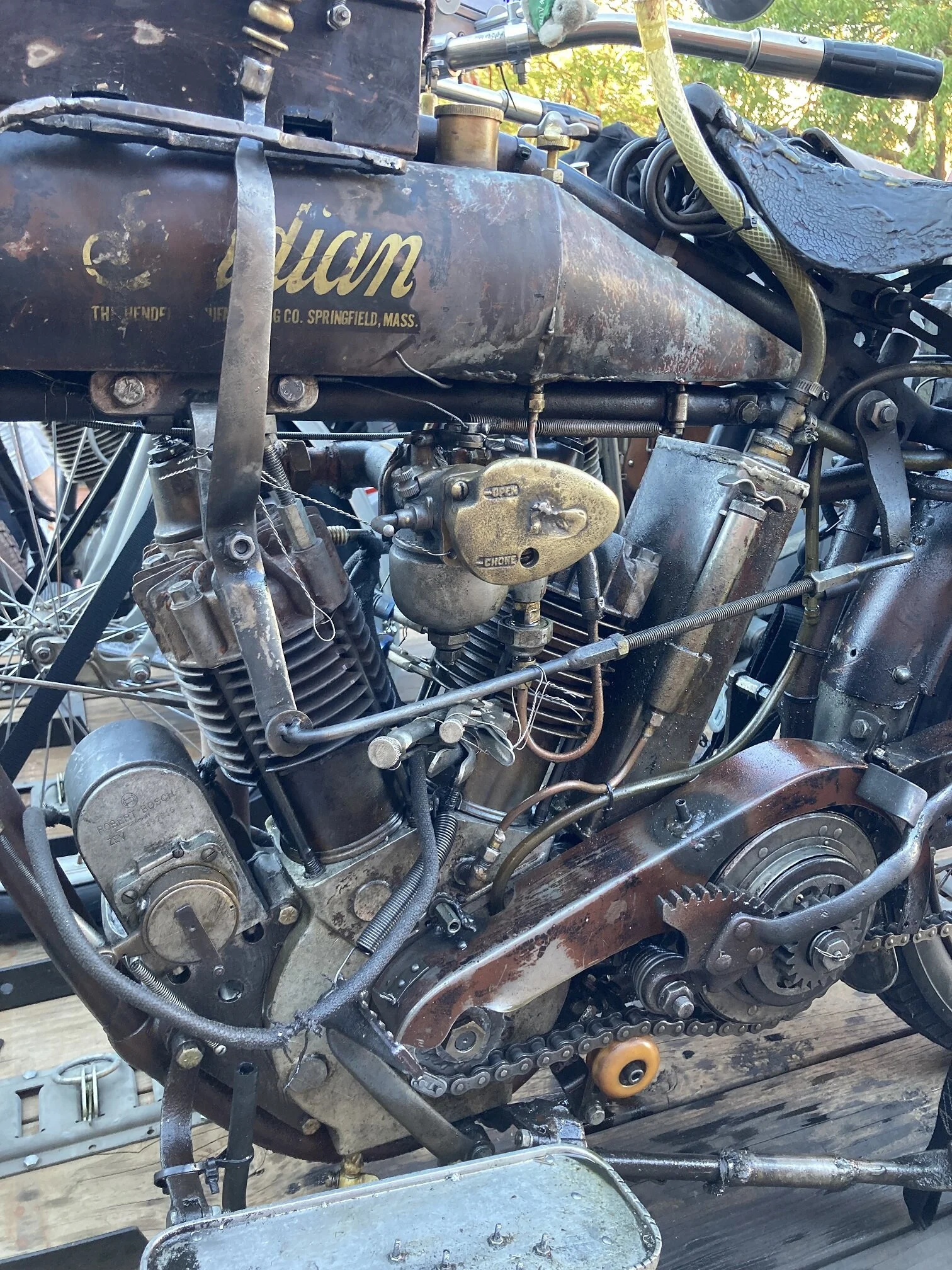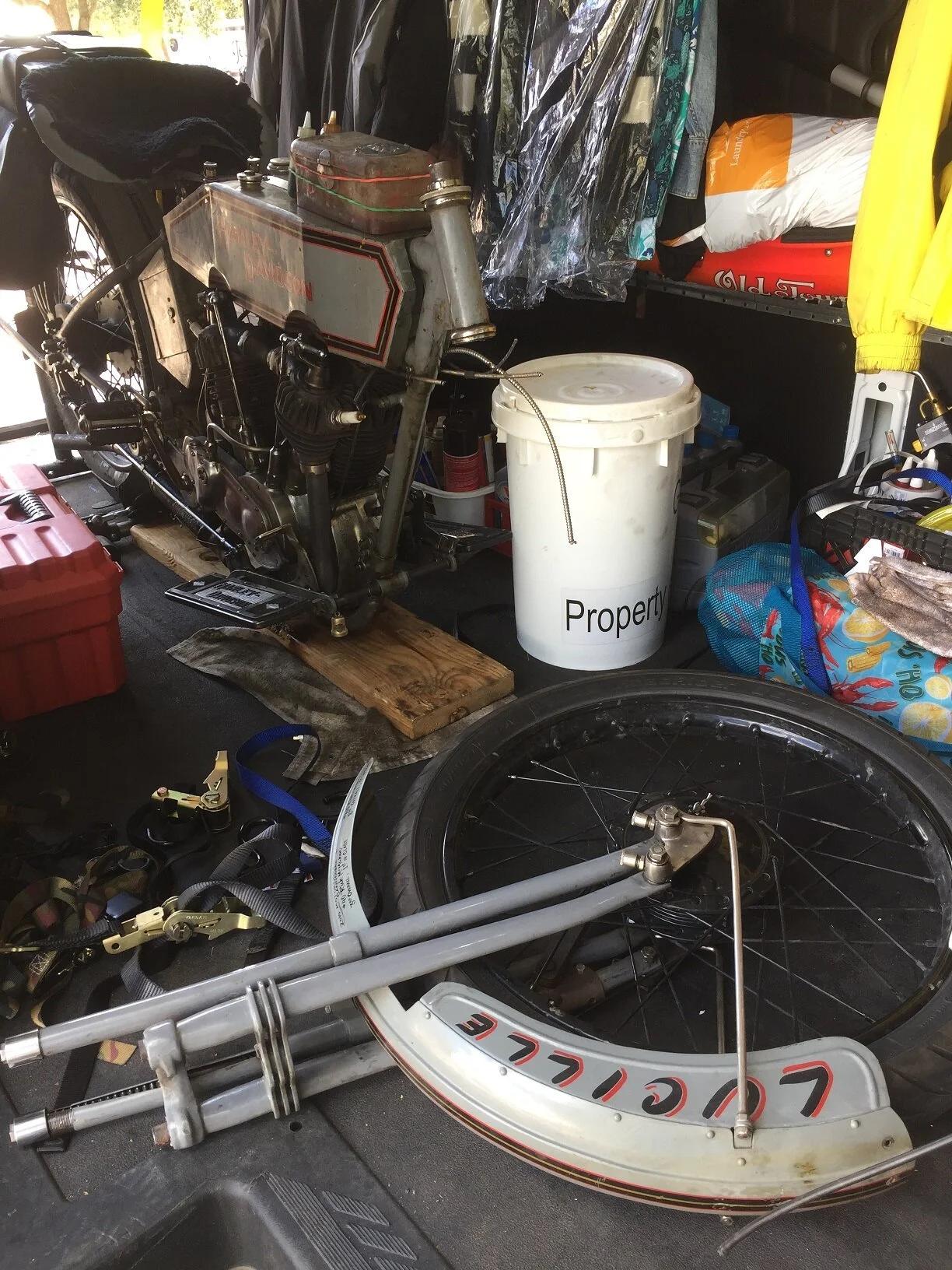 Here is the second casualty I am aware of. #192 Matt Lyman smashed up the front end of his 1918 Indian Powerplus. He suffered a concussion but is doing well.