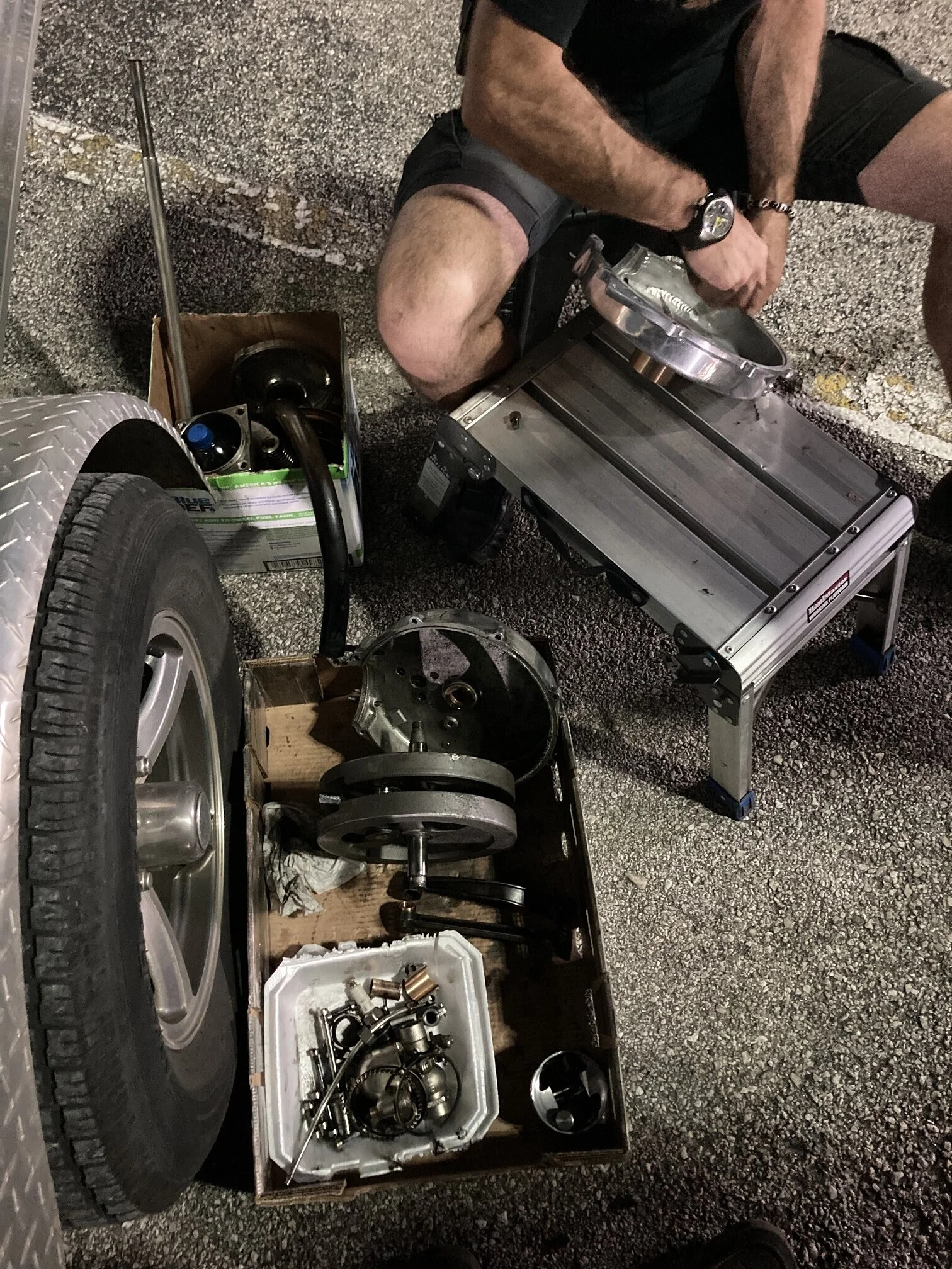 Dorsey, Kent, and Mike spent time trying to solve my missing pedal problem. Zeke found bicycle pedals and adapters yesterday. Turns out the adapter is what I needed but the pedal was a bit too large. The bigger issue was my pedal crank was cross threaded and needed to be fixed. That was where all the time was focused. We were lucky that the Norton team had the specific tap we needed. Team Mike-Dorsey- Kent spent quite a bit of time getting the threads correct. They were really a big help. Tom Banks had a spare pedal he loaned me.