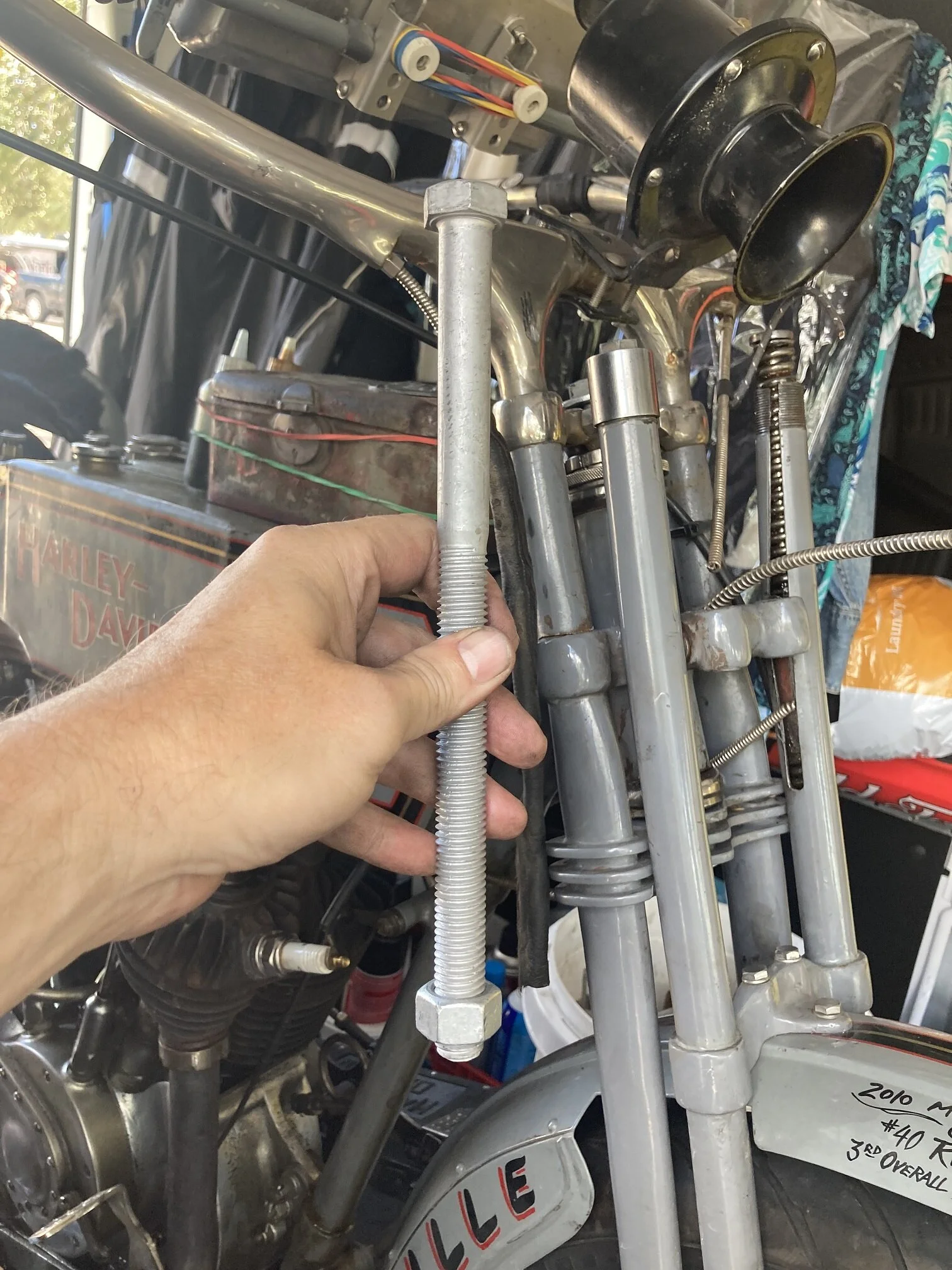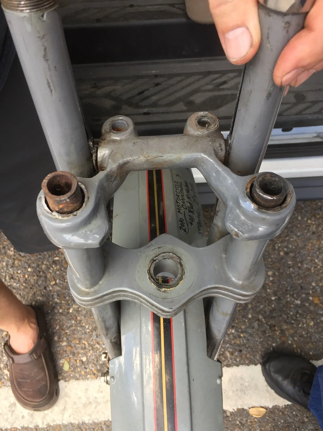 Here is the damage. Both outer fork tubes as well as the center stem broke off. It’s real old metal and the roads were rough, so I am not surprised this happened.