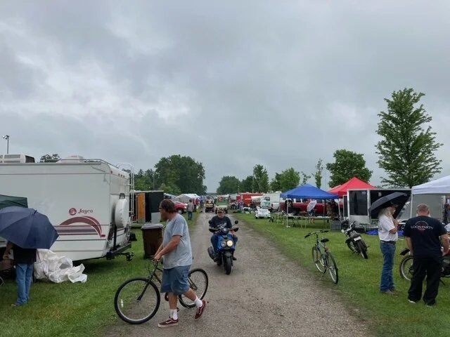 The Sauder Village and campground is awesome! It is the perfect location to prepare for the 2021 AMCA National Meet in Wauseon, OH. Eva and I woke up early to catch the sunrise above Sauder’s Little Lake Erie. We hiked around the trail to find some beautiful horses and glimpses of rabbits dashing across the trail ahead of us. It Was time to visit the Sauder bakery and coffee shop for our morning fix. We also purchased a freshly baked loaf of whole wheat bread and a pound of the famous chicken salad for lunch. Back at camp it was time to do a little maintenance on the Servi car as I am still running hot wired to the coil. After lunch we decided to take another of the numerous hiking trails around the complex. We chose to take the wetlands trail which was full of flowers, lakes and a walnut tree grove. While in the grove Eva spotted a Fox Squirrel. I haven’t seen one of these since I was a kid hunting with Pop. I watched the big brownish-red squirrel for several minutes as he tried to avoid me while never letting go of the walnut he was carrying. We made it back to camp as some of my SMC friends arrived. First it was Erik Bahl and then shortly thereafter SMC President Mike McCloud arrived along with Tommy Harper and Mike Lyle. Things got very entertaining at that point. Erik stayed in the campground while the others checked into the Hotel. There was some disappointment from Tommy when he was advised that there would be no cut-off shorts allowed in the pool. We had a great time of fellowship around the camp and we called it a night as everyone headed back for a good nights sleep.