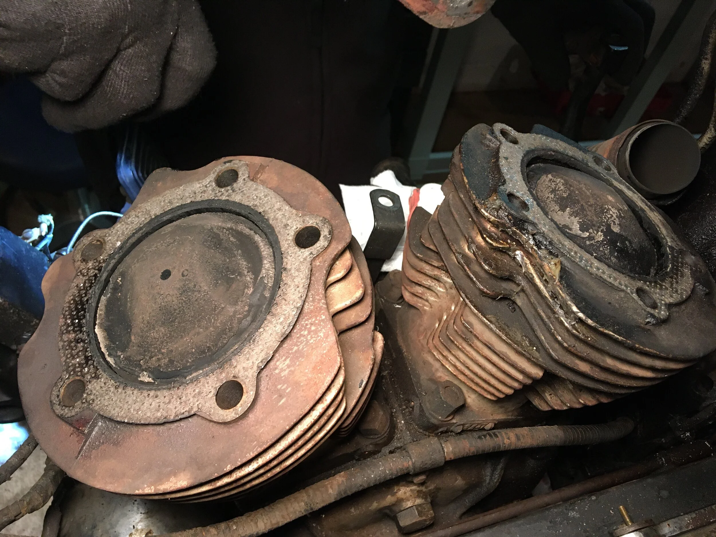 We took a late lunch break at Straight to Ale. Afterwards Dorsey and Kent headed home. Mike and I decided to continue working in the garage. We pulled the front head to go ahead and do a valve job on it as well. It also had a 30 over piston and the cylinder was in similar shape. Mike discovered one of the front motor mount bolts was broken and we addressed a few other things that were not quite right. Overall it was a very productive day. So now I am rounding up parts to include a new intake pipe. Turns out the rear intake pipe was really loose, and actually screwed out somewhat. The threads in the head and on the pipe are pretty worn. I have ordered both a standard and oversize intake with the hope one of those can be used without having to have the head threads machined and reworked which would probably be a pretty significant task.