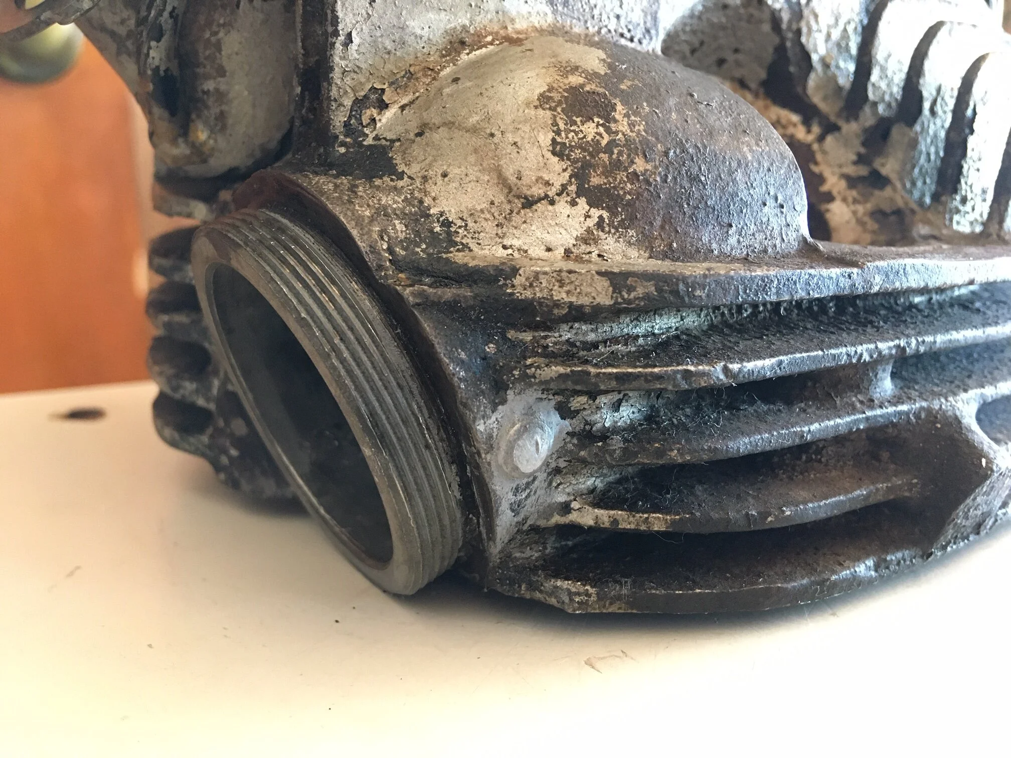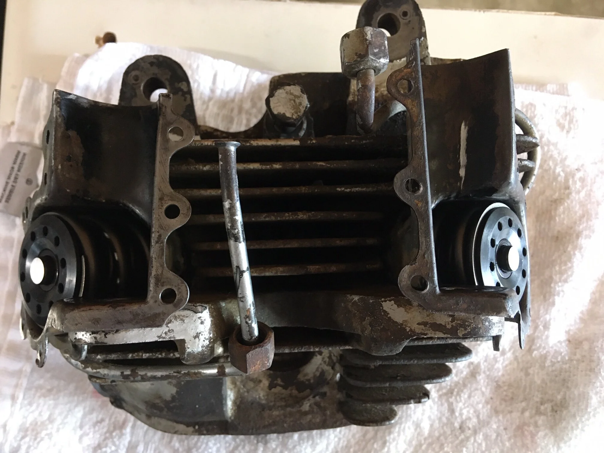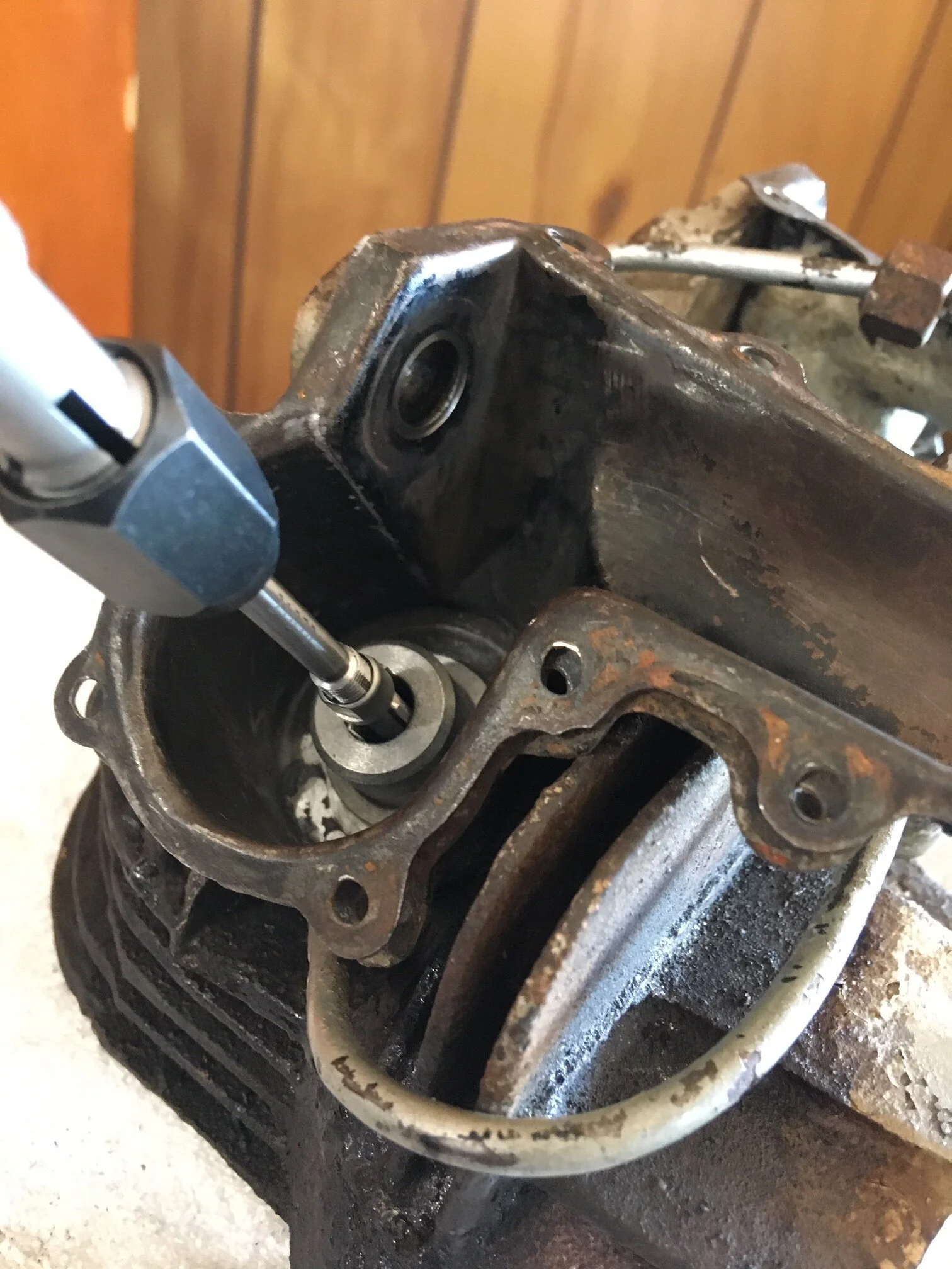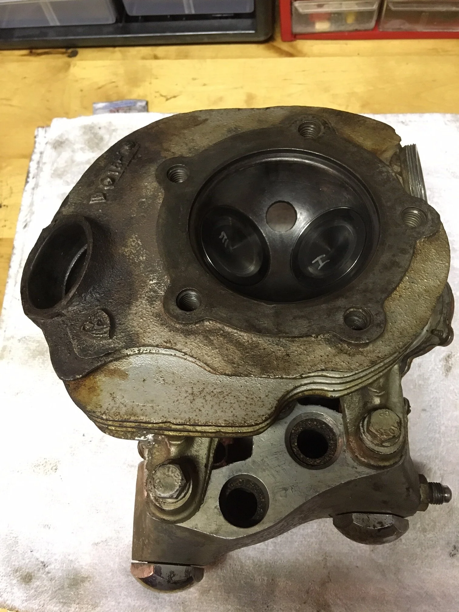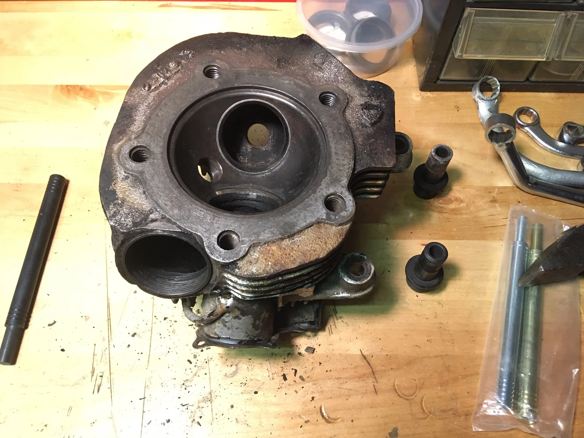 I also decided to replace the valves, guides and springs in both heads. Below you can see where I knocked both valve guides out of the head (they are on the right). Turns out all of my guides were +0.002” over. After doing measurements I replaced them with the same size. You will also notice the intake nipple has been removed.