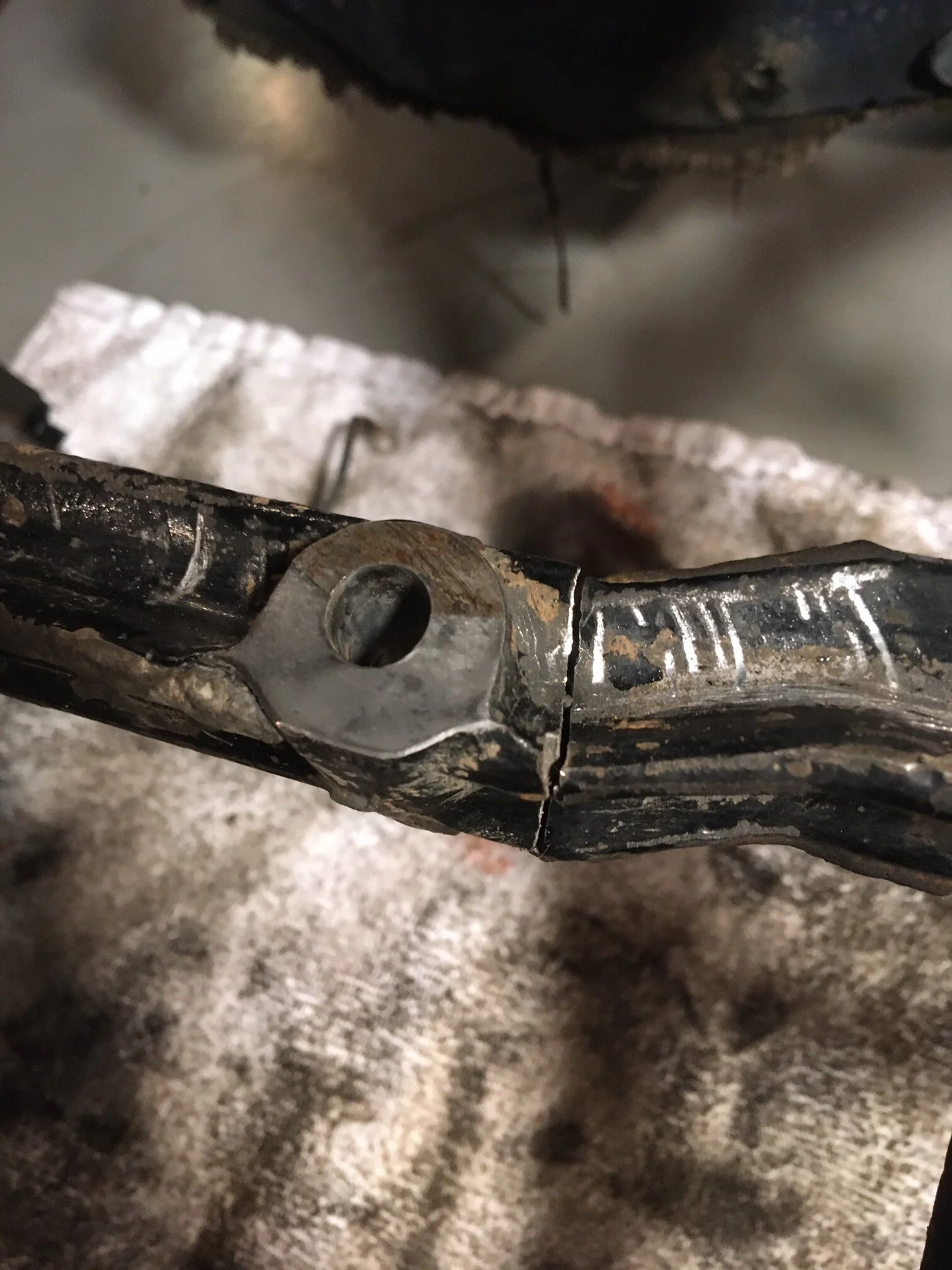 Of course, with both heads done, I started to get excited as I thought I was going to reinstall the refreshed heads, do a couple other minor repairs and get this old girl back on the road in short order! Well nothing is ever as easy as you hope. Remember, all this work was being done with the motor still mounted in the frame. One of those minor jobs was to make sure the motor was mounted properly as I lost the top mount during the Cross Country Chase. So, I was examining the lower front motor mounts, and something looked a little off in the frame motor mount. I started to scrape off some of that 70-year-old dirt and grease and lo and behold the frame forging was cracked. Well, out comes the motor and I cleaned everything up to get a better look. OUCH. Notice the nice crack in the photo below. The next task is to weld this up and start to move this project forward again. It’s just another slight delay….
