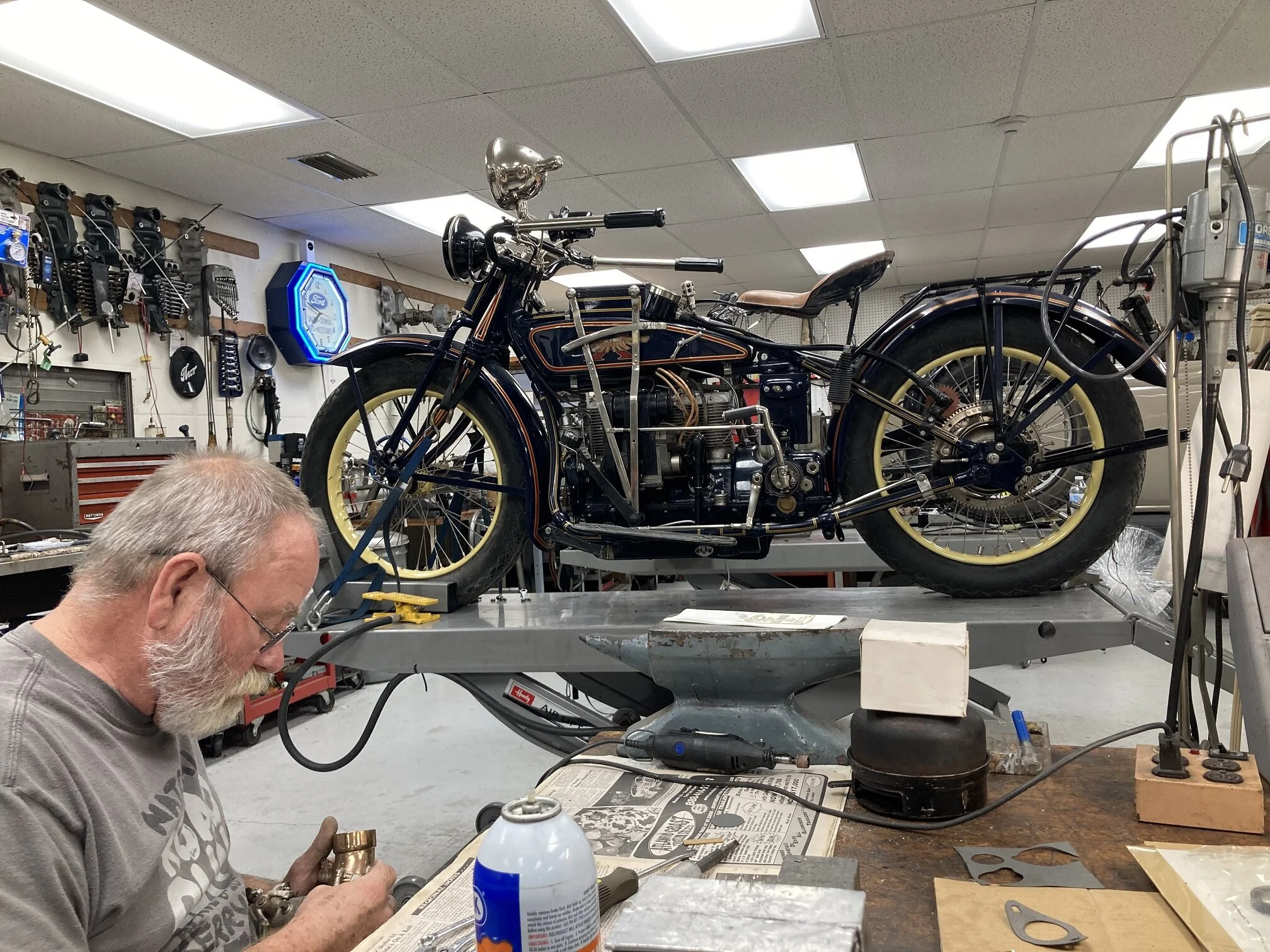 As we sat in the parking lot that evening discussing my new pump, the conversation meandered to four-cylinder motorcycles. As things seem to work for me, especially when I am not planning on anything – things happen!! It turned out when Joe returned to Florida he was helping a friend sell some motorcycles. In this group of bikes there was a 1925 Henderson Deluxe four-cylinder machine. After returning home from Montana and working for the week to catch up on business, I was off to Florida to look at this potential acquisition. The bike had been neglected somewhat in the past few years. We put her on the lift in Joe’s shop. Went through the magneto, rebuilt the carb, and after about 7 hours work, she fired up.